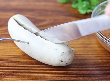 冷蔵庫で12時間ほど解凍したヴァイスヴルストを、一度沸騰して火を消したお湯へ投入し8~10分温めてください。