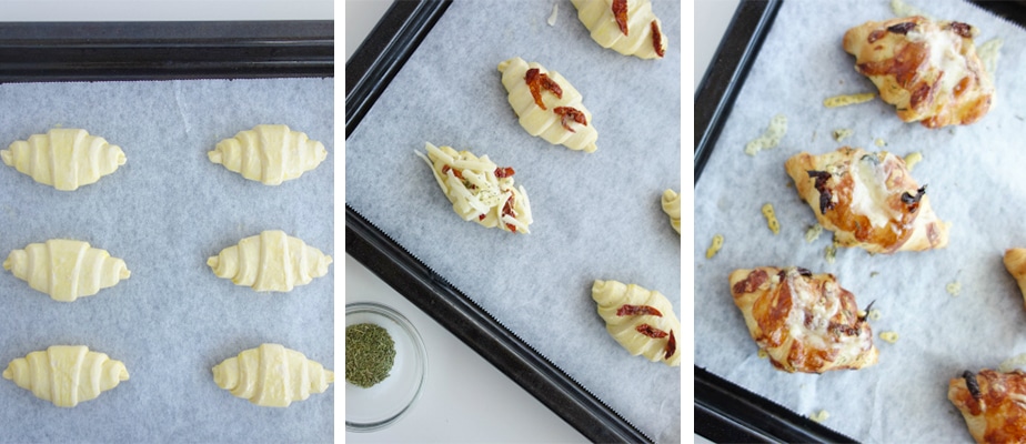 ②ドライトマトは細切りにする。グリエールチーズはチーズおろしで細長くおろす。ミニクロワッサン生地の表面が汗をかいたようになったら、その上にドライトマトをのせ、チーズのおよそ1/3量をトッピングし、オレガノまたは、セージを散らす。